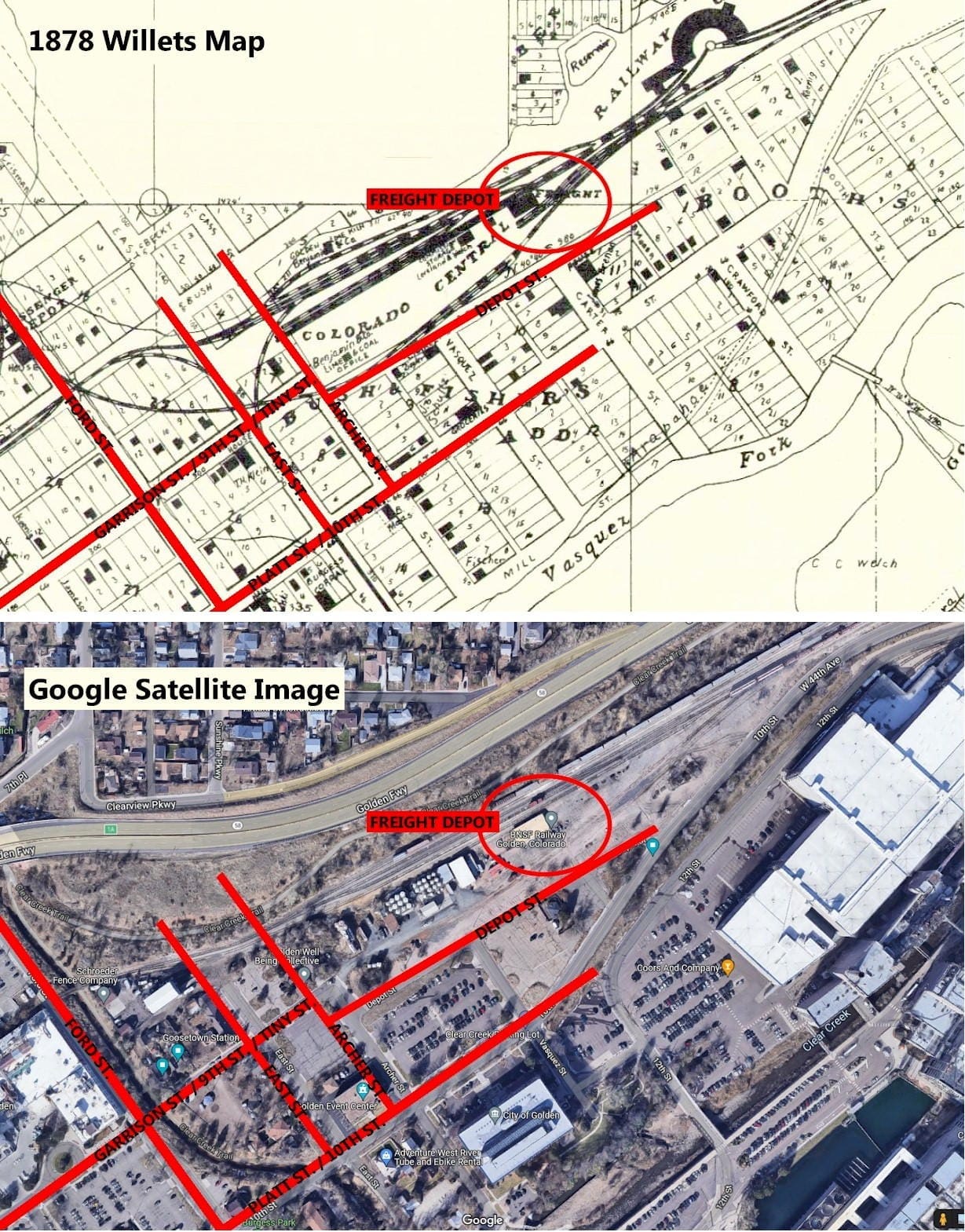 The freight house appears in many old photos and maps, including the 1882 Birdseye View Map of Golden: