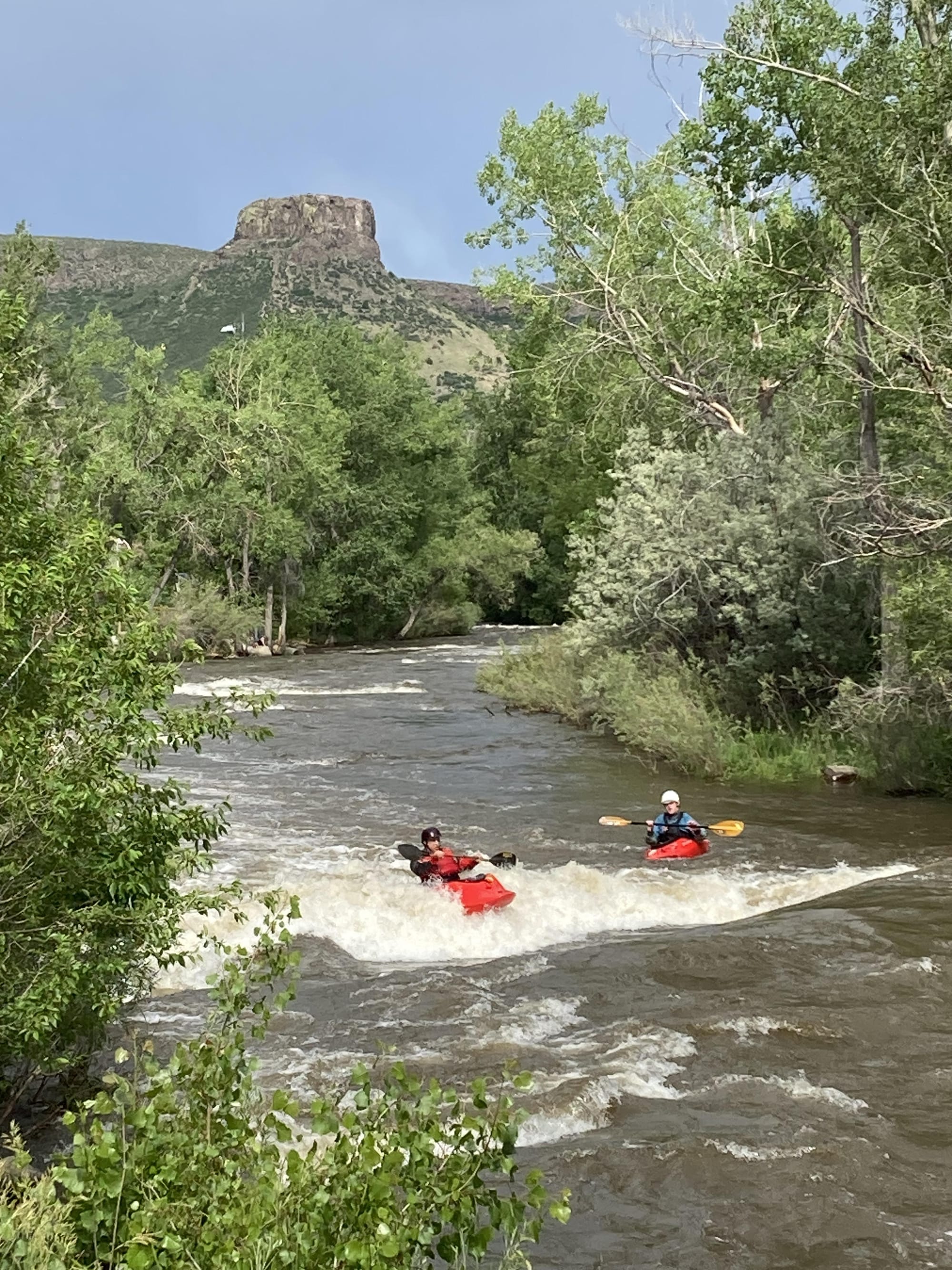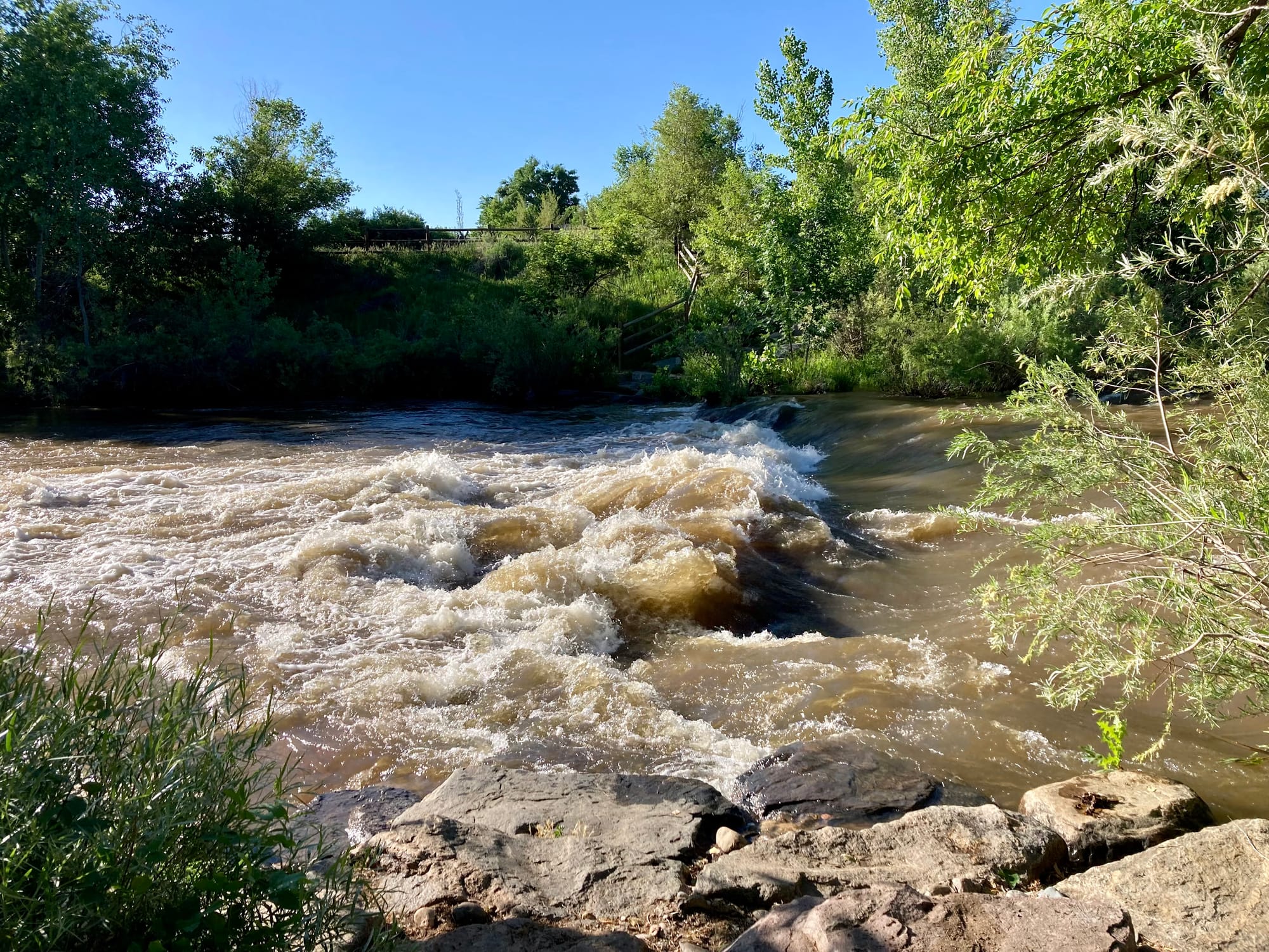The usually clear and placid Creek--with just enough current to be fun for tubers--is now brown with churned soil and moving downstream at a frightening clip. The Jeffco Sheriff has closed the Creek to tubers and swimmers. Only kayakers are allowed at this time.