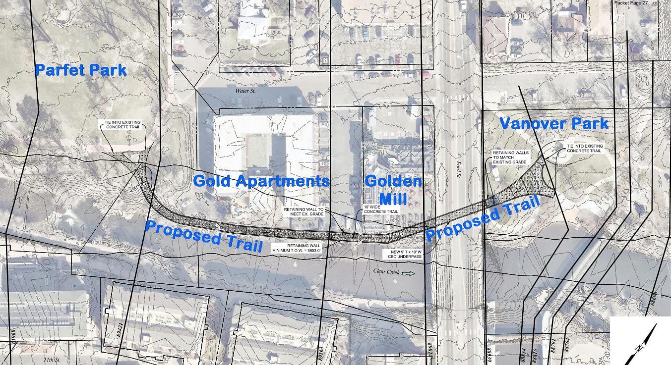 Over the years, there has been some discussion of building a trail on the north side of Clear Creek, to connect Parfet and Vanover Parks. When the current owners acquired the Golden Mill, they agreed to an easement that would permit such a trail on the south edge of their property. When I last heard discussion of this project, the owners of the Gold Apartments had not granted an easement, but that was in November of 2019, so things may have changed since then.