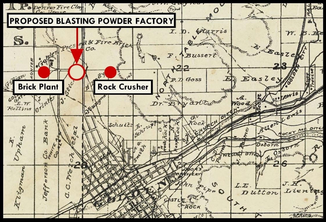 The June 17, 1909 Colorado Transcript announced TROJAN POWDER COMPANY TO BUILD FACTORY HERE. The article stated that the Pueblo-based company would build a factory here and it would employ forty men. The previous week, the Golden Improvement Club (a precursor to the Golden Chamber) had wined and dined the representatives of the company and promised to donate a site if they would build a factory here.