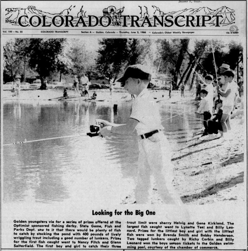 The June 2, 1966 Colorado Transcript celebrated the annual Fishing Derby at the pond in Lions Park. The Golden Kiwanis Club had hosted the first fishing derby for Golden's children in 1955. They gave prizes to kids catching the first fish, the biggest fish, and the first to catch the limit of five fish. About 150 children participated, and a good time was had by all.