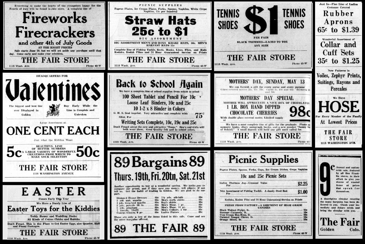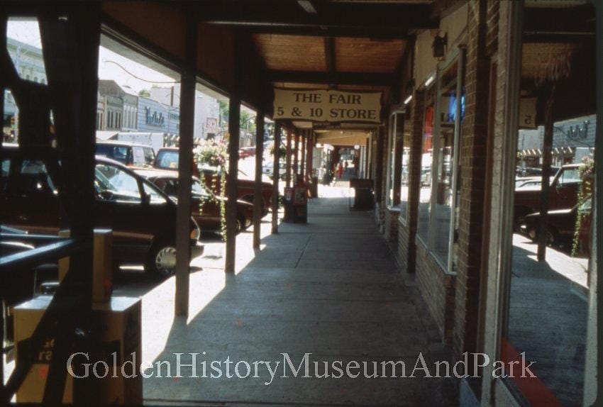 West side of the 1100 block of Washington Avenue, including sign for The Fair 5 & 10 Store - Golden History Museum collection