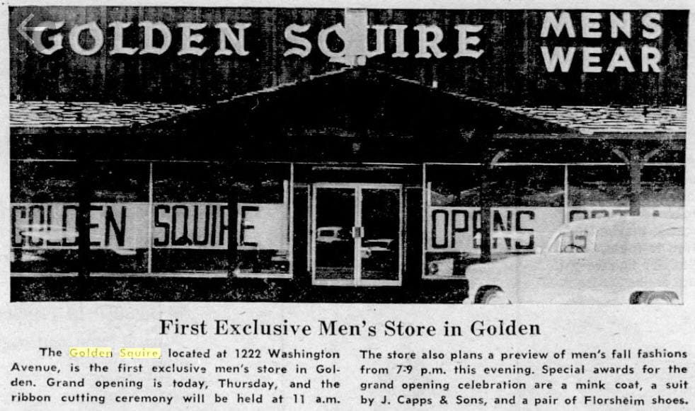 The following October, new owners opened Golden Squire in that same location. Showing a surprising lack of historical awareness, they proclaimed it to be "Golden's first exclusive men's store."
