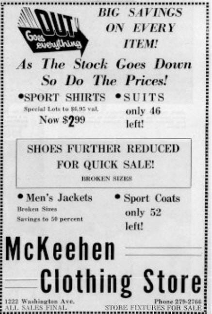 In January of 1964, the McKeehens closed the store and liquidated everything, from merchandise to fixtures, thus ending the 93 year life of the clothing business.