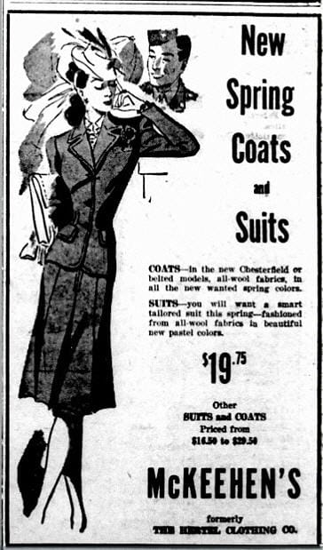 Mr. and Mrs. McKeehen were originally from Golden, and after Mr. McKeehen finished his military service, were eager to return home. They soon bought the Hertel business, and, some months later, gave it their own name. They expanded their offerings, and for the first time, the former men's store offered women's and children's clothing.