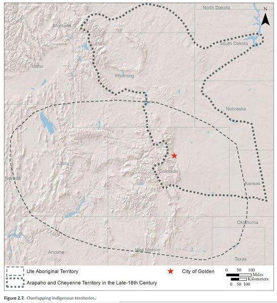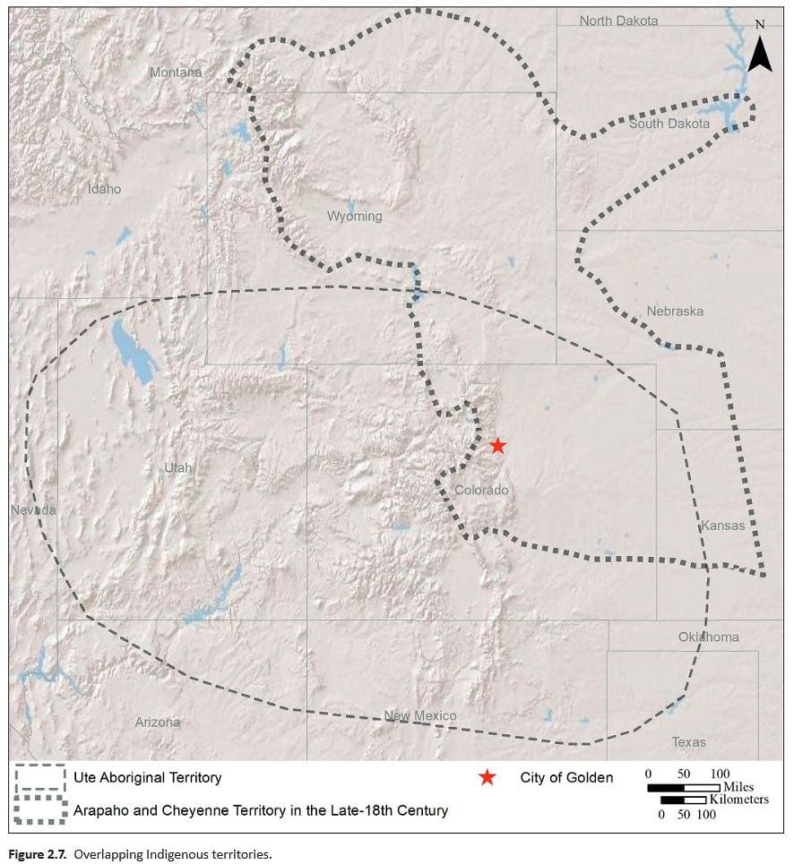 As seen in the chart, the tribal territories overlapped with Golden right in the middle. The Utes occupied the mountains but hunted on the Plains, while the Arapaho and Cheyenne were Plains Indians.