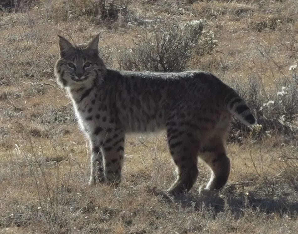 Typically, between 32-37 inches long with short, approximately 6-inch bobbed tails, - hence the name, bobcat - our residents have buff to brown fur, sometimes with a reddish tinge, with brown and black stripes and spots and have facial ruffs and ear tufts. The ears are black-tipped and pointed, with short black tufts, and the lips, chin and undersides are off-white in color. The tail has a black spot on the tip and white underneath and the forelegs have distinctive black stripes. As evident from the picture, they are extremely well camouflaged in their regular habitats. They have excellent hearing and vision. You will likely not see our bobcats on open prairie/grassy areas as their favored habitat include foothills, canyons, mesas and plateau with brush and woodlands. You may see them in winter as they don’t hibernate.