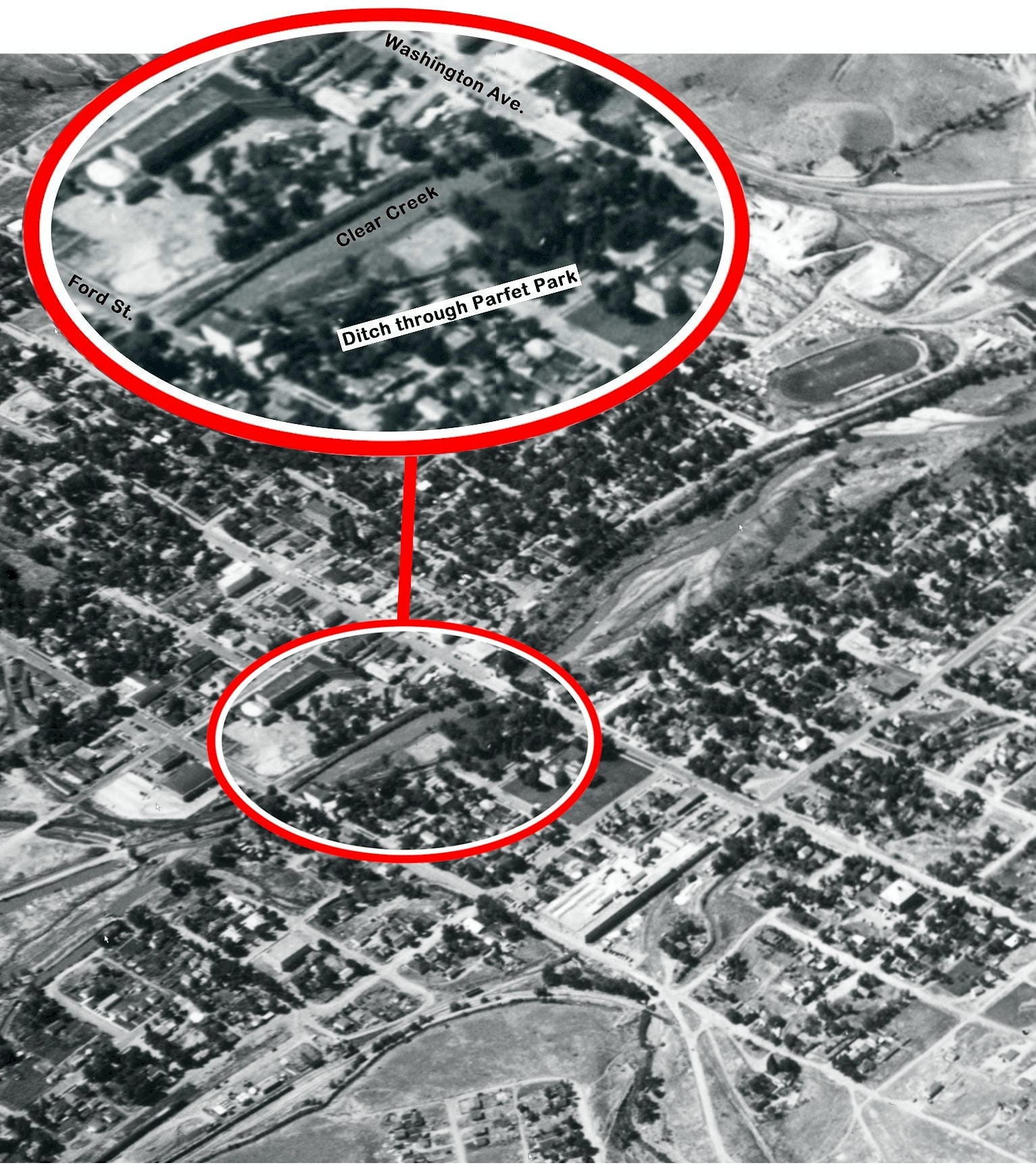 Parfet Park was bisected by a mill ditch until the mid-1950s. The water running through the ditch powered the grinding operations at the Golden Mill.