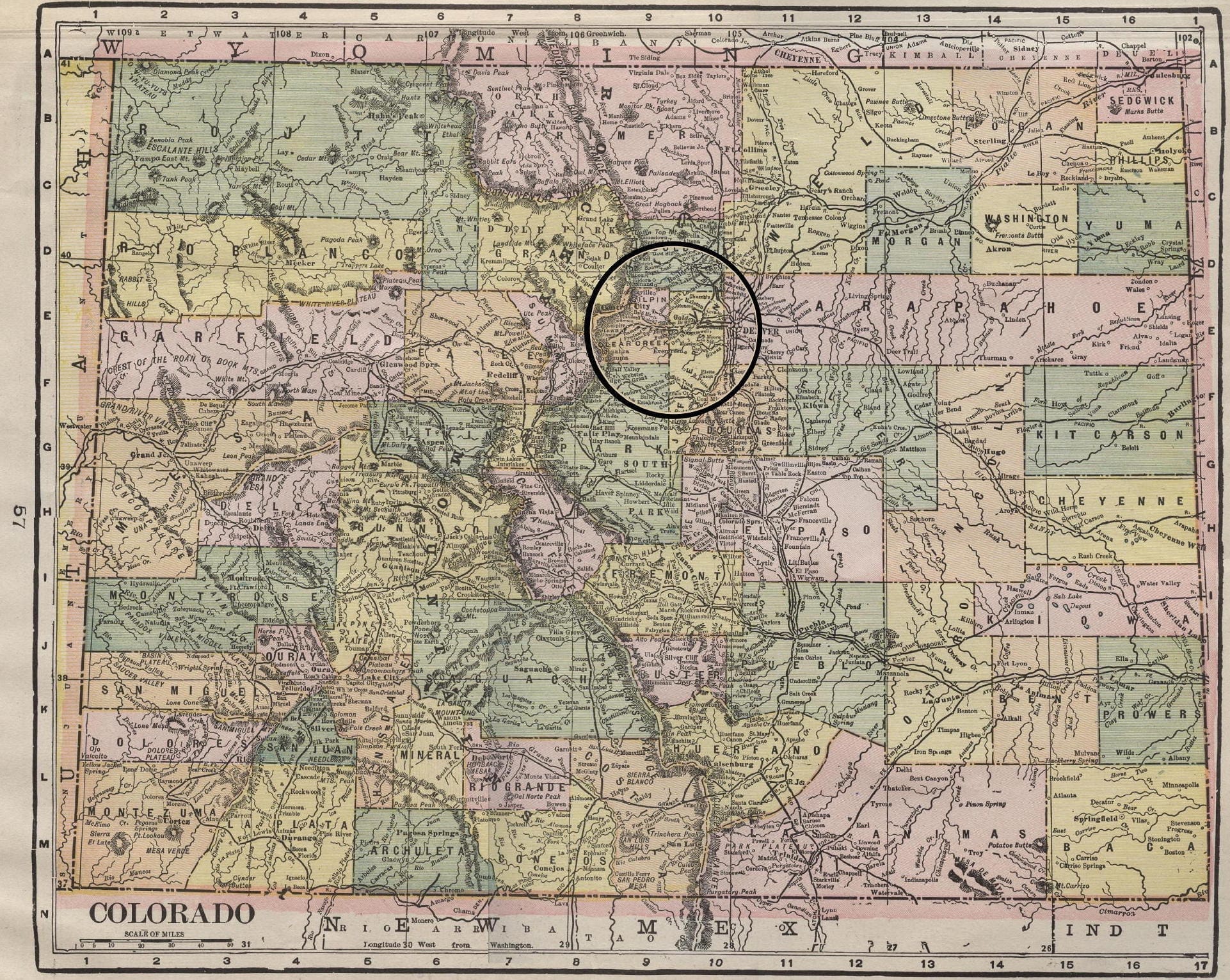 I recently bought a 1901 map of Colorado. Naturally, I was most interested in the Golden section. Do you recognize the line heading west, into the mountains, with the circles at intervals? That’s the Colorado & Southern Railroad, and the circles are stops along the line. At that time, it went to Central City and Black Hawk to the northwest and Idaho Springs and Georgetown to the southwest.