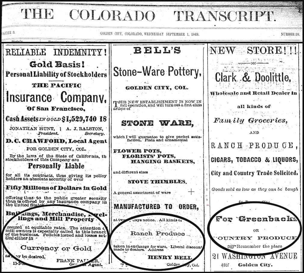 The September 1, 1869 Colorado Transcript includes several examples of “trade.” The Pacific Insurance Company accepted “Currency or Gold.” Bell’s Stone-Ware Pottery exchanged pottery for “Ranch Produce.” Clark & Doolittle took either “Greenbacks or Country Produce.”