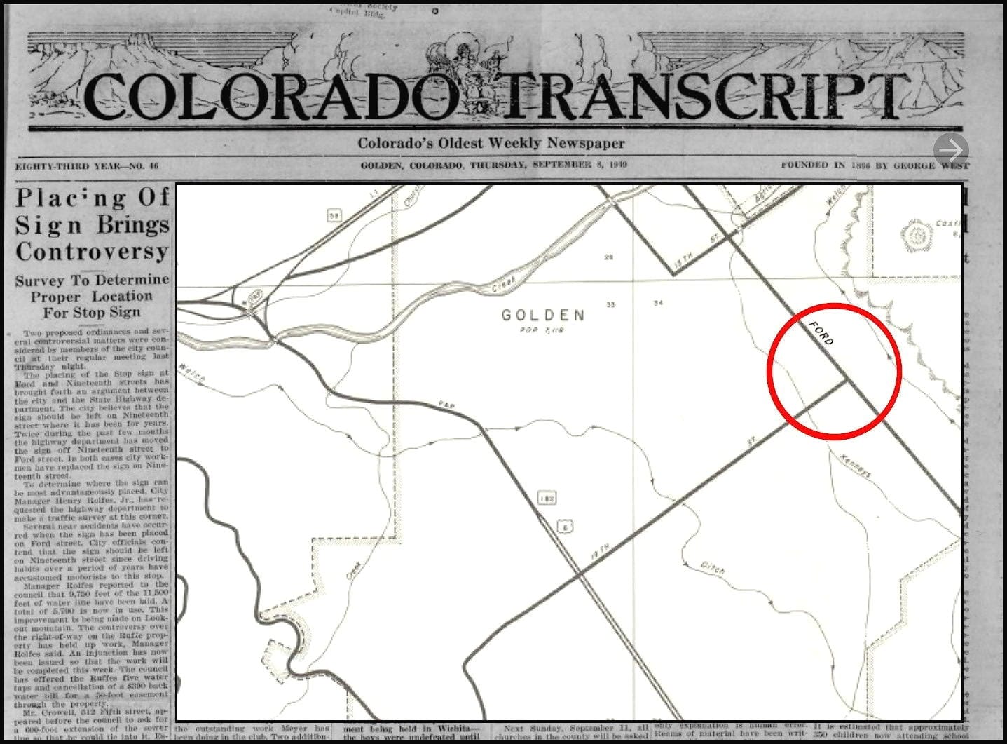 The September 8, 1949 Colorado Transcript described an ongoing controversy between the City of Golden and the State Highway department. Several years earlier, the City had installed a stop sign on 19th Street at Ford. This forced drivers on 19th Street to yield to the continuous flow on traffic on Ford.