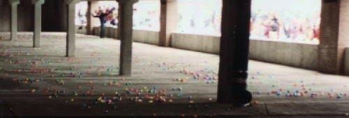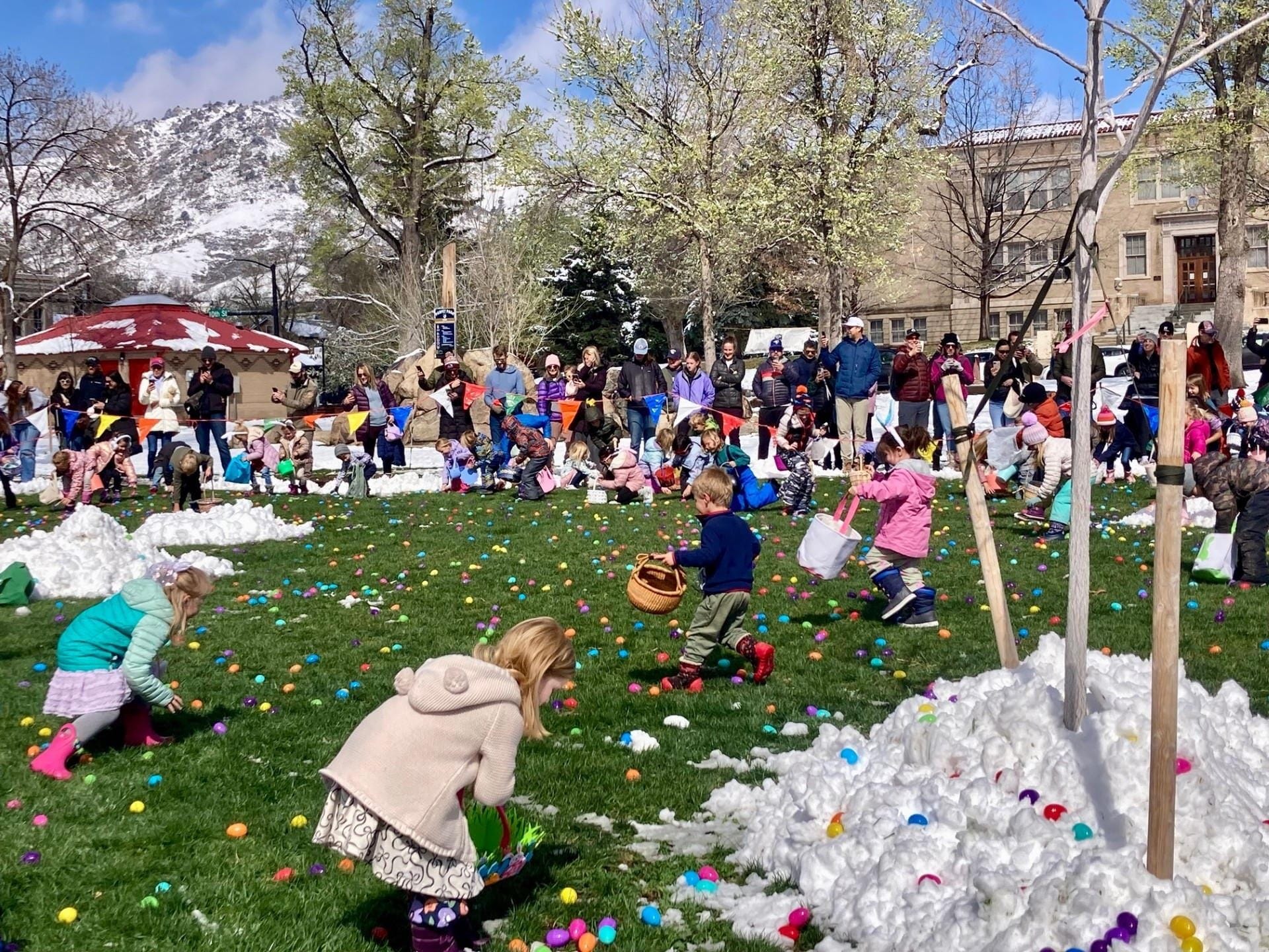The 1998 Easter Egg Hunt occurred on a snowy morning. The planners decided they couldn’t hold the event in the park, but the Golden Hotel was under construction at that time, and they allowed the event to take place in their parking garage.