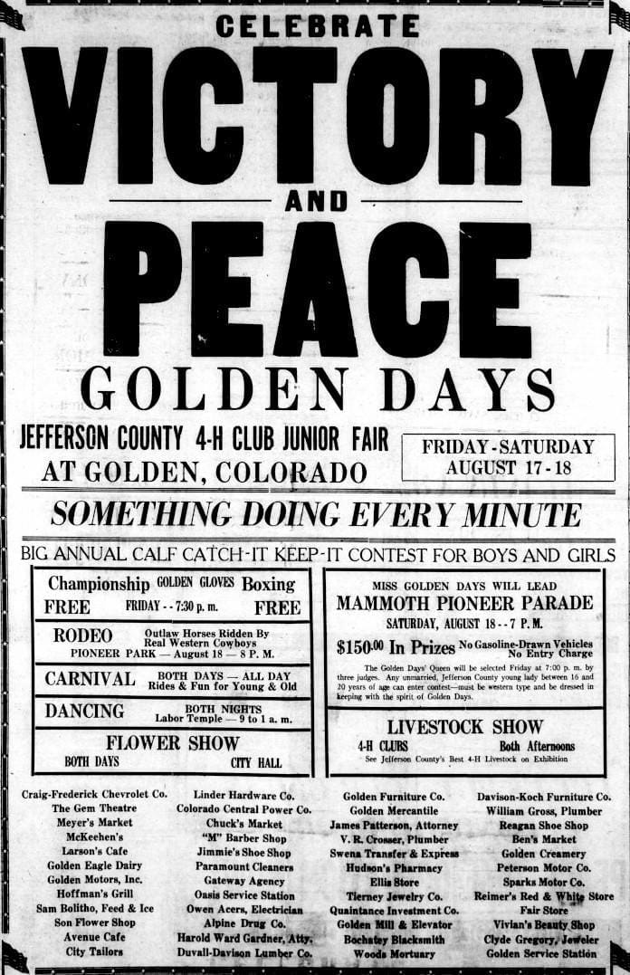 The back page of the paper held a full-page ad for Golden Days (a precursor to Buffalo Bill Days). The event had been planned for quite some time, but the words “Celebrate VICTORY and PEACE” had been added at the top.