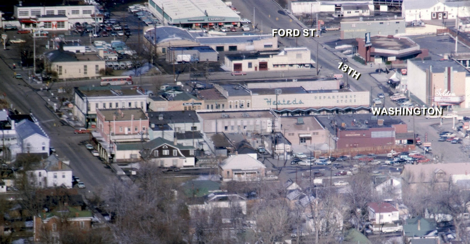 This photo by Bill Robie, taken in March of 1965, shows Ford Street with several former businesses, including the Chevrolet dealership.