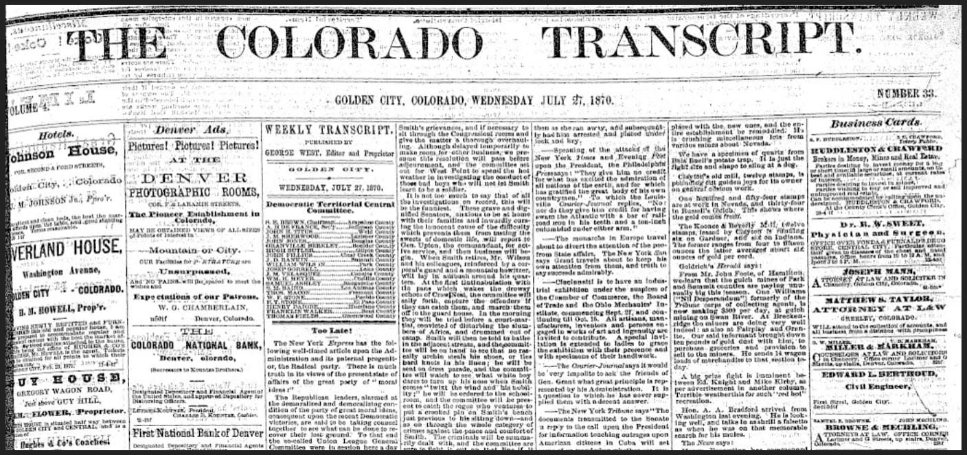 Many thanks to the Golden History Museum for providing the online cache of historic Transcripts, and many thanks to the Golden Transcript for documenting our history since 1866!