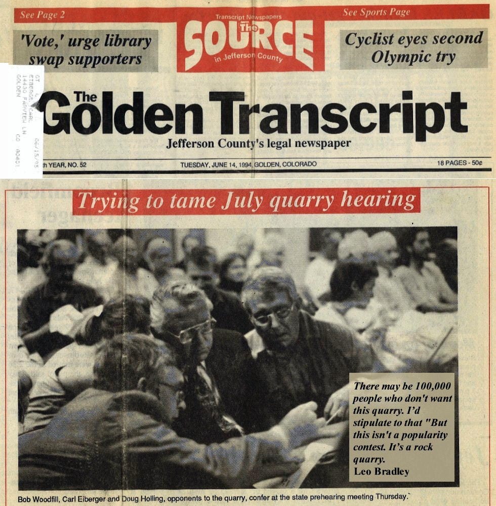 On this day in 1994, attorney Carl Eiberger, along with community opponents Bob Woodfill and Doug Holling, prepared for a pivotal prehearing meeting ahead of the July hearing before the Mined Land Reclamation Board—the issue at stake was a proposed quarry on South Table Mountain.