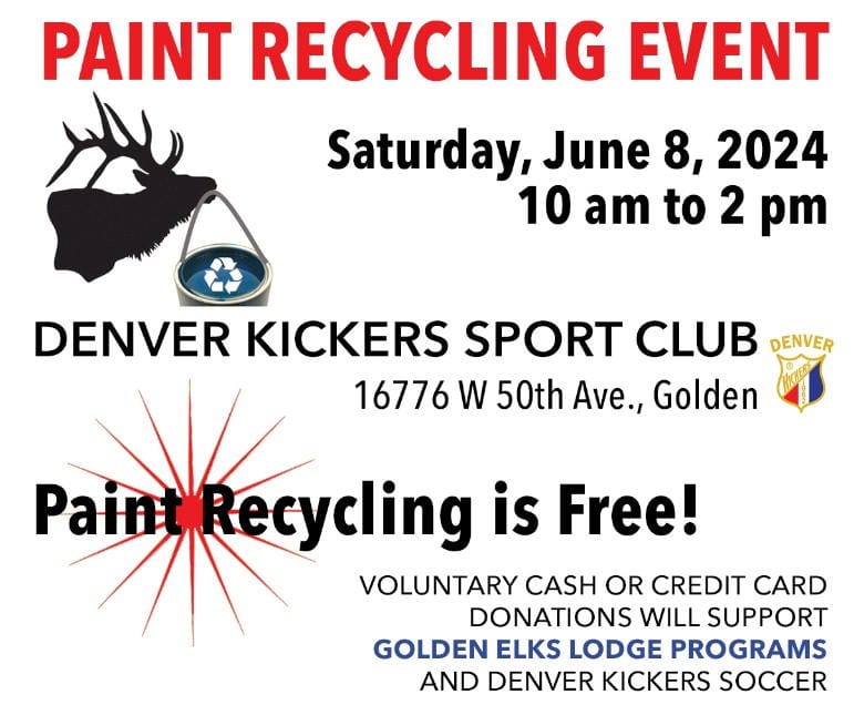 Paint recycle is free. Your voluntary cash or credit card donations are appreciated and accepted and will support Denver Kickers Soccer and Golden Elks Lodge programs.