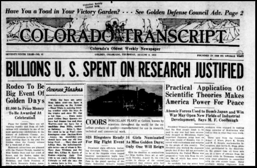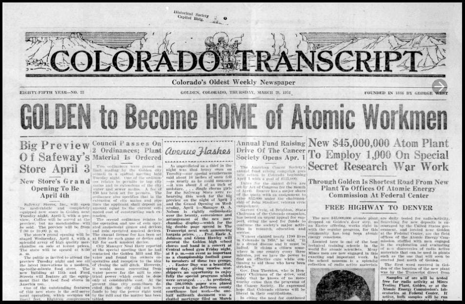 The March 29, 1951 Colorado Transcript announced the Federal Government’s plan to build a $45 million “Atom Plant” north of Golden. They did not state that the plant would produce a part used in atomic weapons–that information would have been top secret.