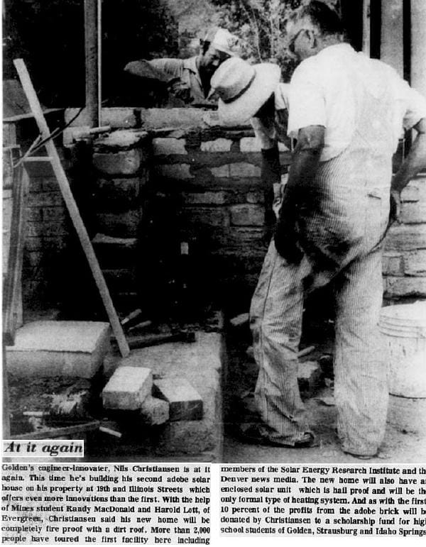 In 1977, he built an adobe home on his property at 19th and Illinois. It was designed to be highly energy efficient, heated largely by solar collectors. The home was of great interest to the staff at the Solar Energy Research Institute (later rebranded as NREL) and in its first year it was toured by more than 2000 people. In 1978, he built a second adobe house on the property.