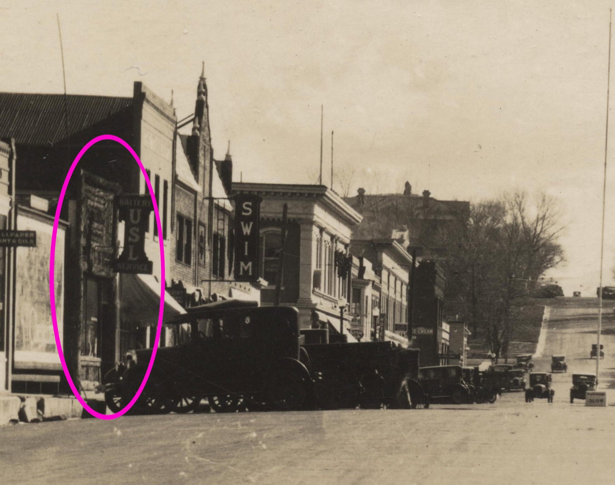 This photo, taken in the 1920s, shows the building that burned in 1988. Note the “SWIM” sign that indicates the location of the Plunge Swimming Pool