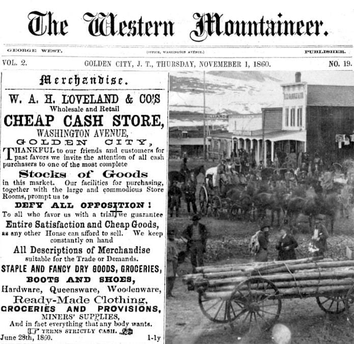 Advertisement for Loveland’s store in the November 1, 1860 Western Mountaineer. The photo on the right, which comes from the Denver Public Library Western History Collection, shows Washington Avenue stores, teams, and wagons. The tallest building was William Loveland’s original store.