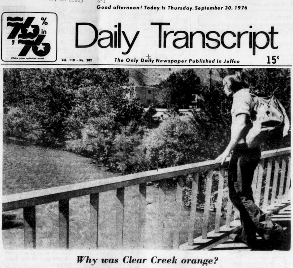 The September 30, 1976 Transcript reported that Clear Creek had turned bright orange the day before. According to the EPA, “the coloring came from iron oxide-saturated water flushed out of a mine just downstream from Blackhawk after weekend rains. [They speculate that] water accumulated in ponds in the mine as a result of numerous rains over the past month. An EPA investigator located the pollution source but was unable to get into the mine.”
