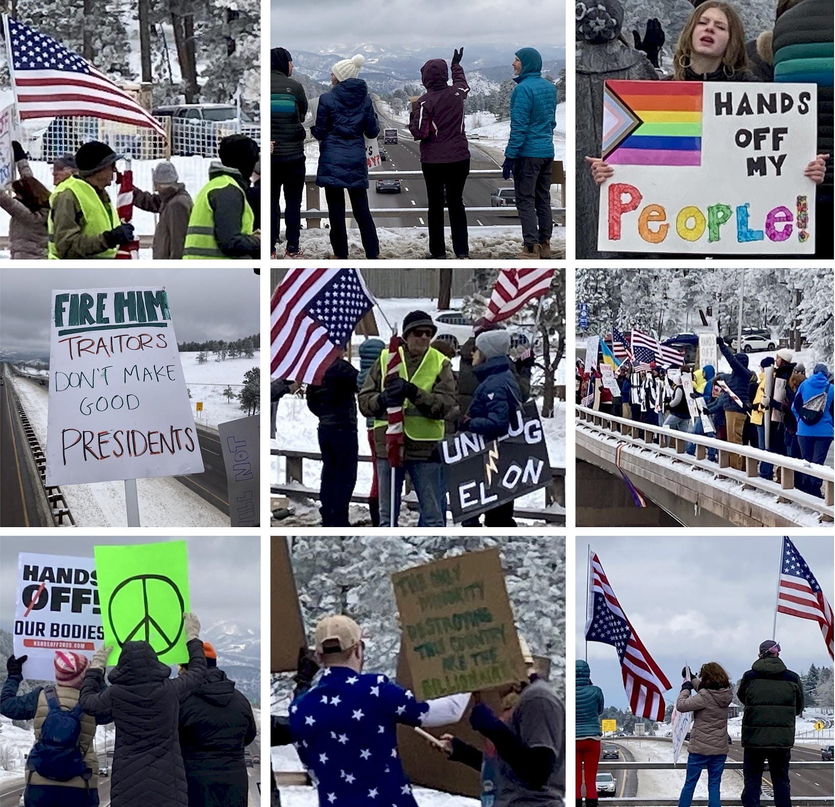 A local contingent participated in the nationwide protests yesterday, lining the bridge over I-70 at the Genesee exit. Among the signs they held signs were: