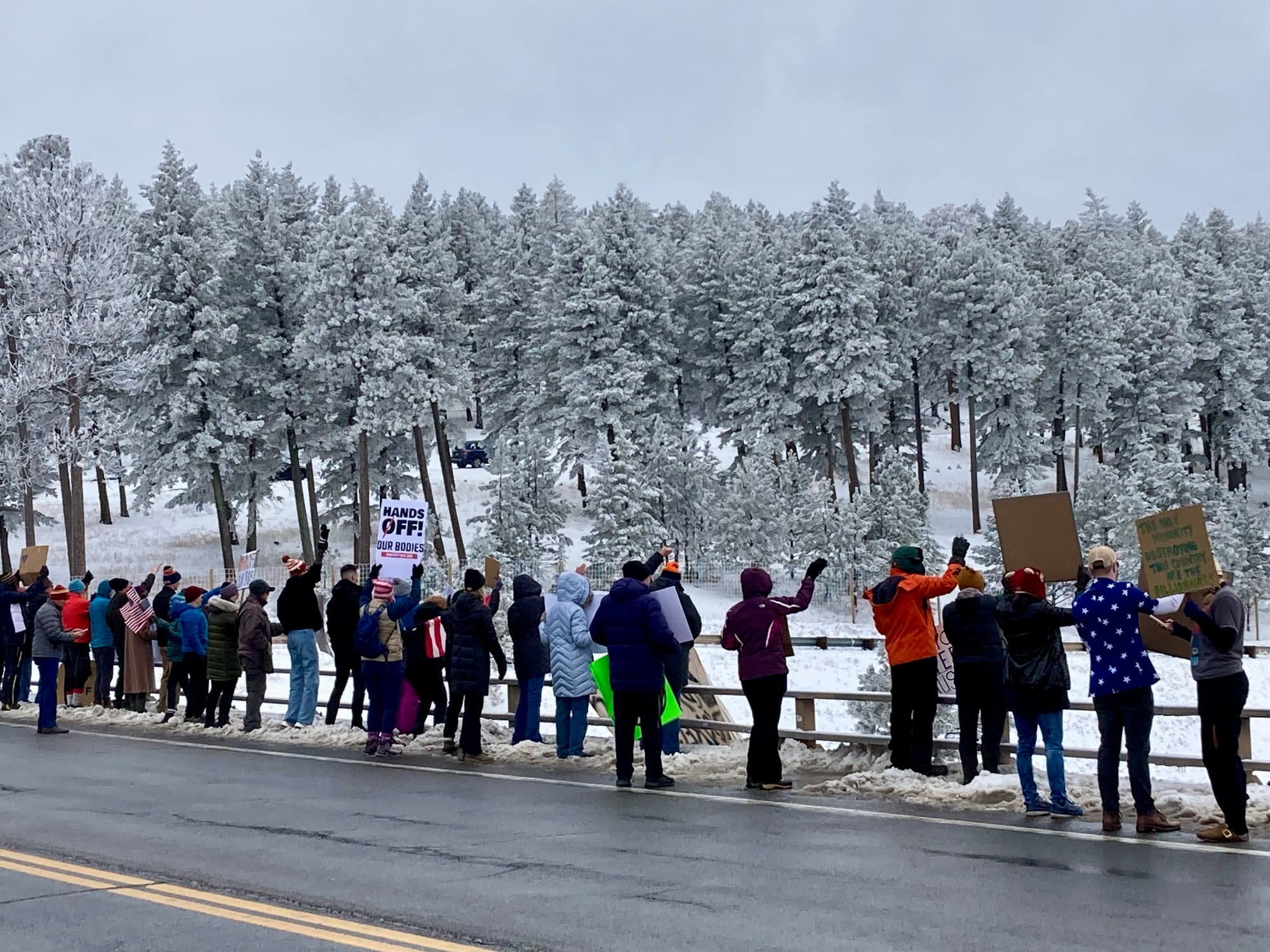 Protesters lining the bridge at the Genesee exit over I-70 - Photo by Chris Davell