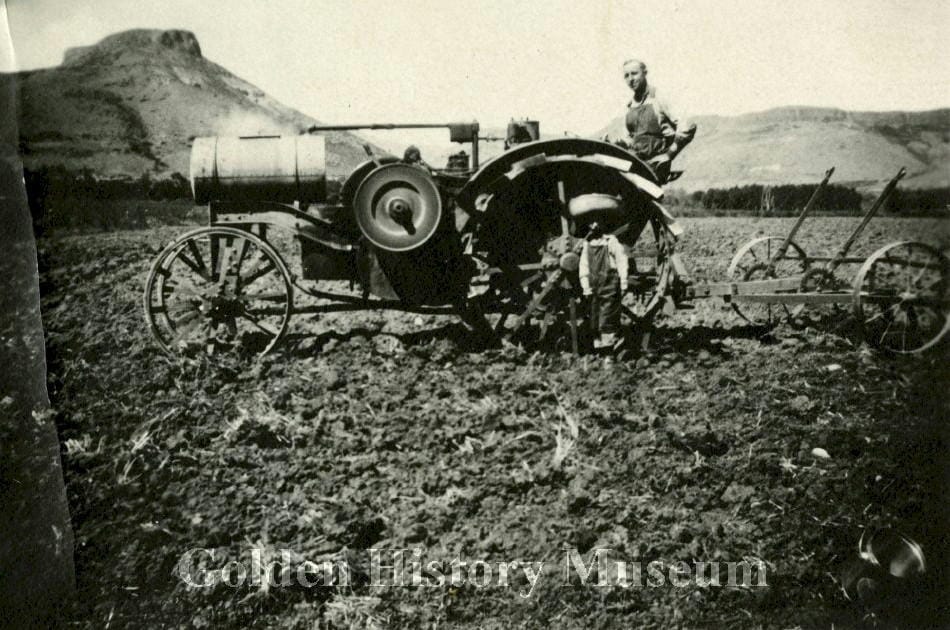 Jim Mannon with First Tractor – c. 1920s Golden History Museum Collection- click to enlarge Black and white photograph of Jim Mannon seated on his first tractor, a 1924 Titan, at the Mannon family farm in Golden, CO. Jim’s son Clyde Mannon is standing in front of the rear wheel. North and South Table Mountains are in the background.