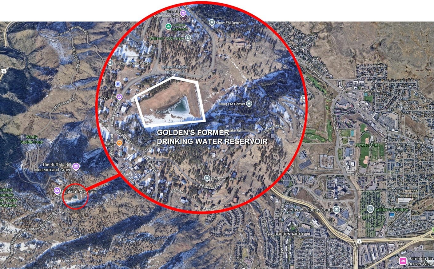 As close-in water sources (such as Clear Creek) became increasingly polluted, Golden sought "pure" water from more remote sources. In 1904, the City built a pipeline from Beaver Brook, several miles to the west. The pipeline filled a reservoir atop Lookout Mountain (approximately where we now see a cluster of antennas).