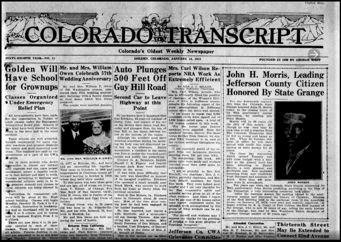 The January 18, 1934 Colorado Transcript announced that adult education classes would begin at the Golden High School on January 22nd. These classes would be free to participants and were made possible through a Federal “Emergency Educational Relief plan.”