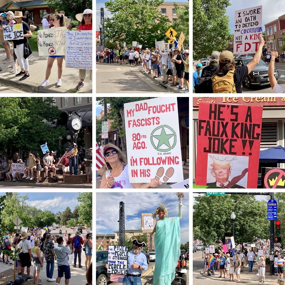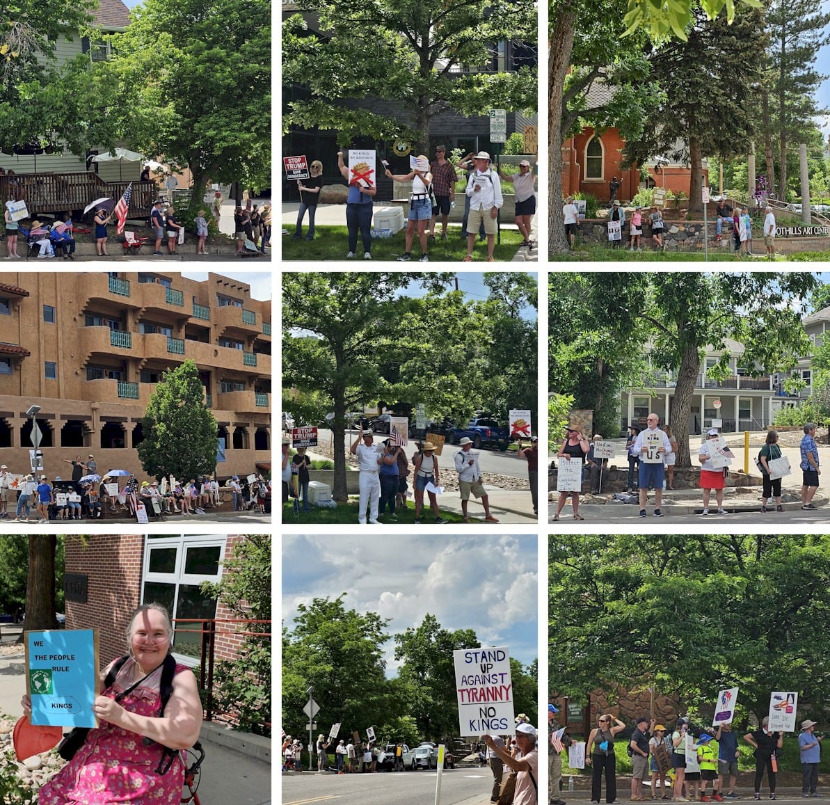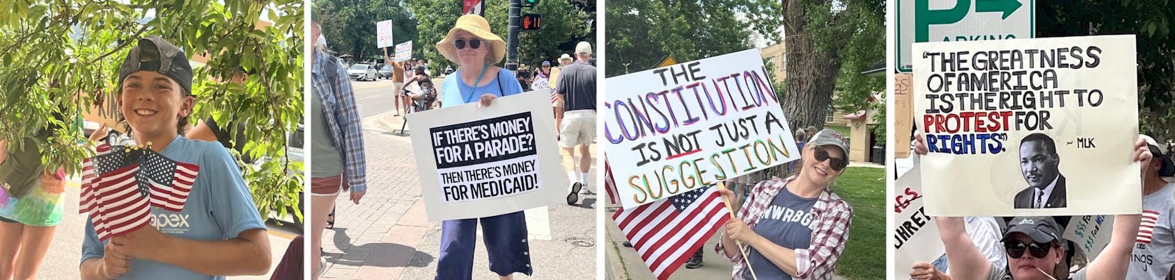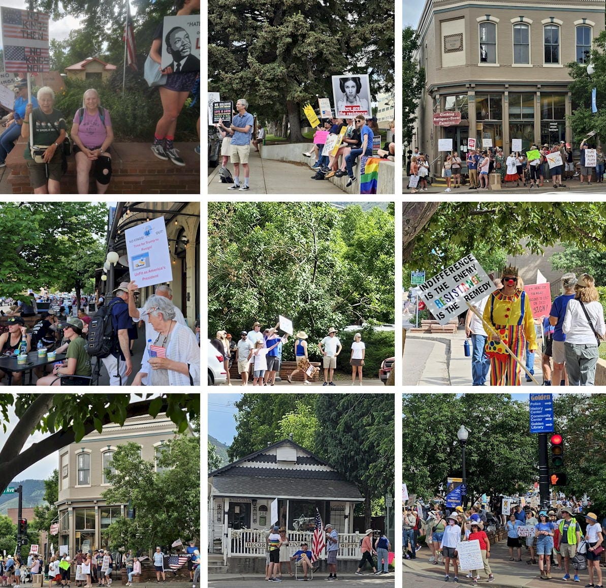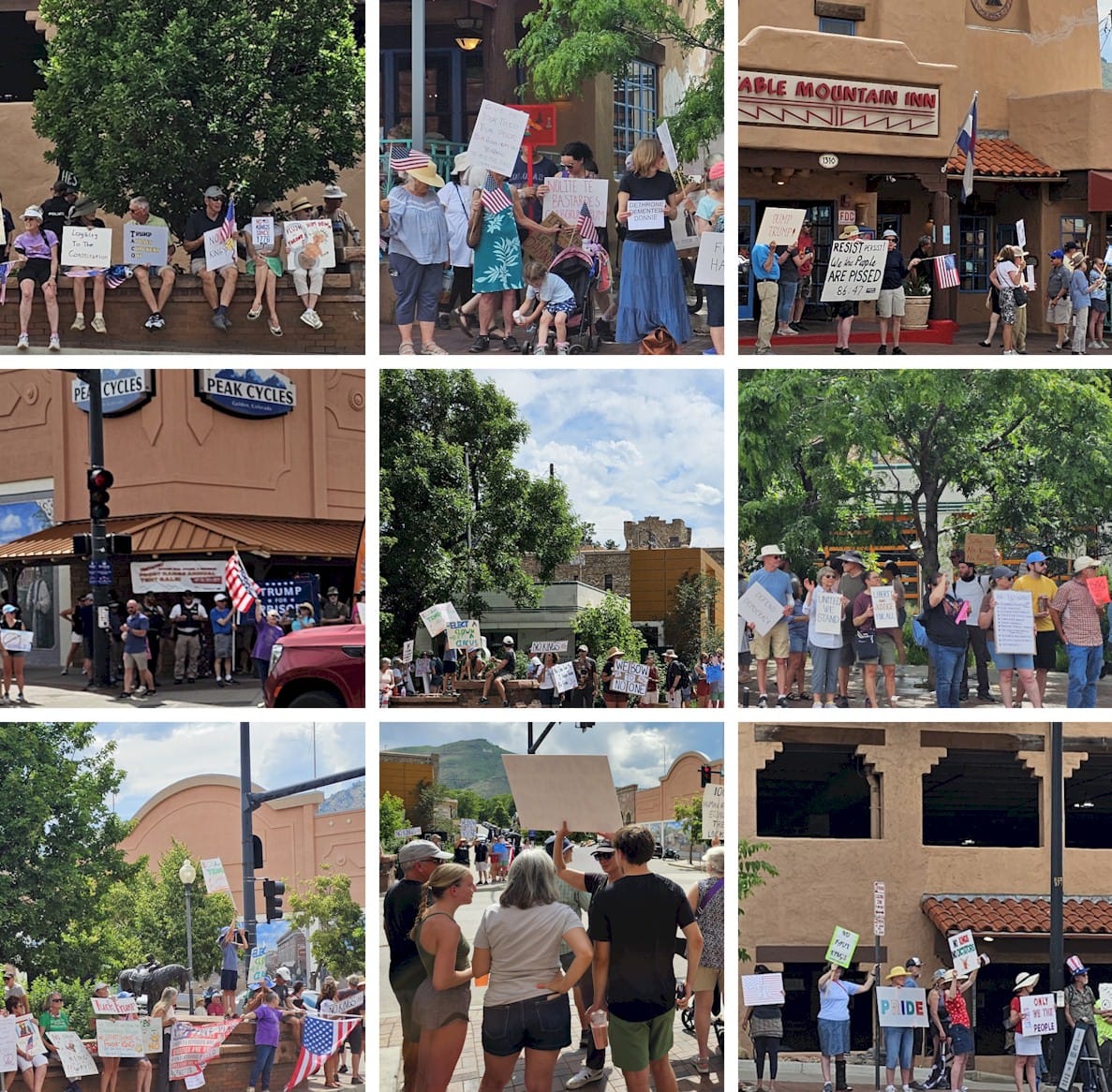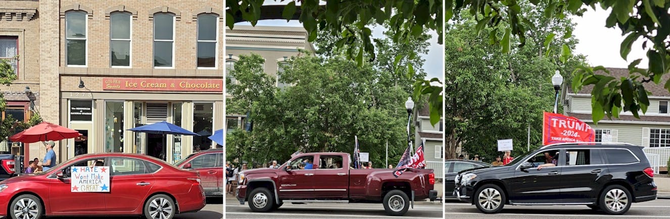 The cars driving up and down Washington Avenue were active participants in the protest. Most were opposed to the current administration and honked their horns to show support. A few (a Mercedes and a Denali) sported large Trump flags and they too did a lot of honking. One adolescent boy leaned out of a car window flashing a thumbs-down sign, and a few young men stood in front of the Welcome Center wearing MAGA hats. I saw no signs of incivility on either side.