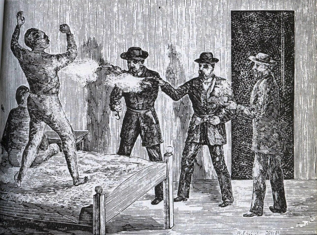 One might wonder why Ed Franklin would go upstairs to bed after his gang had shot a bartender. The testimony at the inquest explained that he was drunk. His guns weren’t “out of reach–” there were no guns in the room. The deputies were trying to put handcuffs on him and take him into custody, but there was much swearing and wrestling as he resisted arrest. The part where he instructed them to shoot him in the heart did appear in the testimony, and one of the deputies obliged.