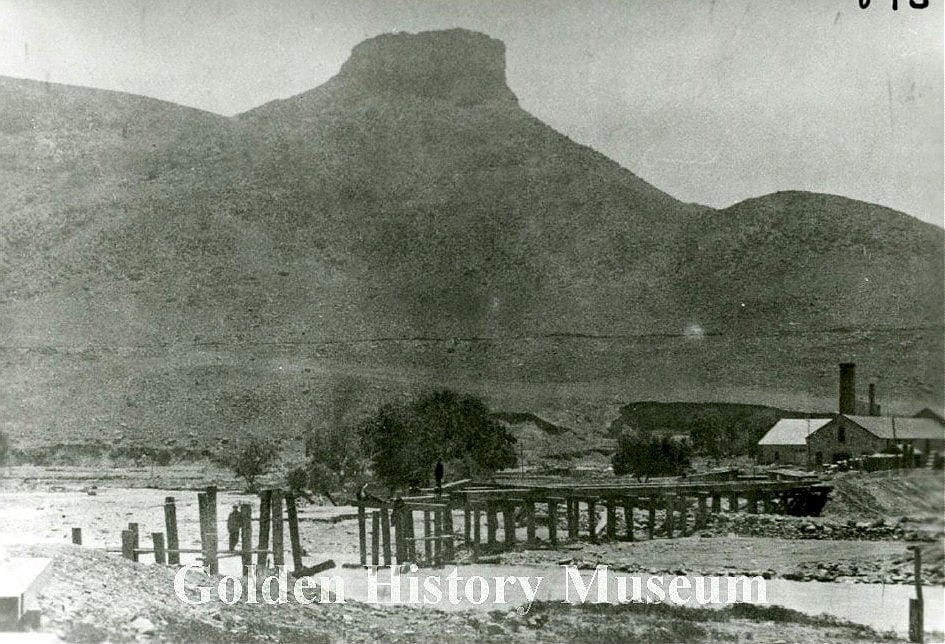 The Cambria Tile and Brick buildings appear on the right side of this 1896 photo. The real focus of the photo was the railroad bridge that had been washed out by a flood. - Golden History Museum collection - enlarge