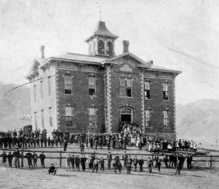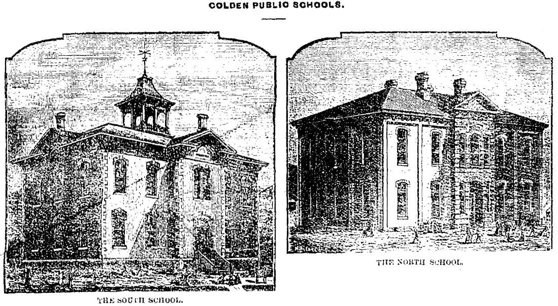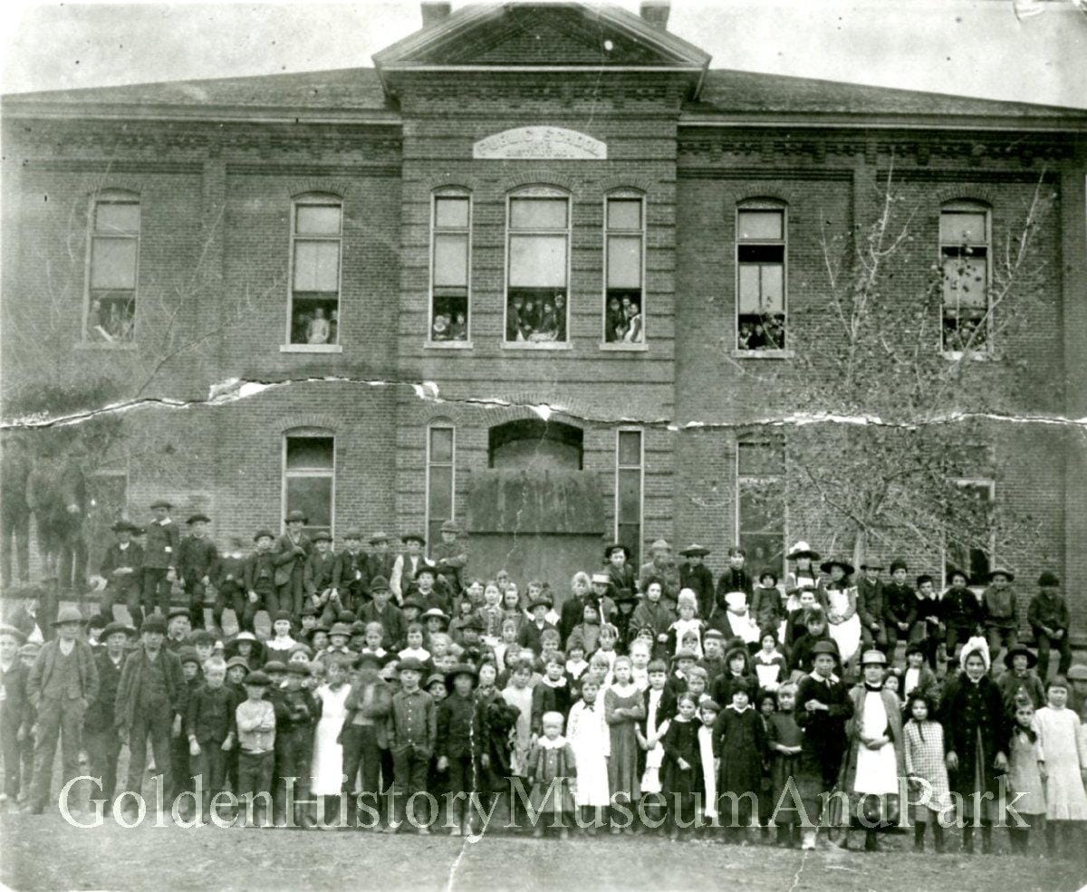 The May 19, 1880 Colorado Transcript provided the following glowing description of Golden's public schools. The South school had opened in 1873. It was immediately over-crowded, so in 1880 they added the North school. South school served the primary through secondary grades. North school accommodated the primary school children from the north side of Clear Creek. When the north side children reached high school age, they moved over to the South school. One interesting mention in this article: there were only 7 teachers for 501 students.