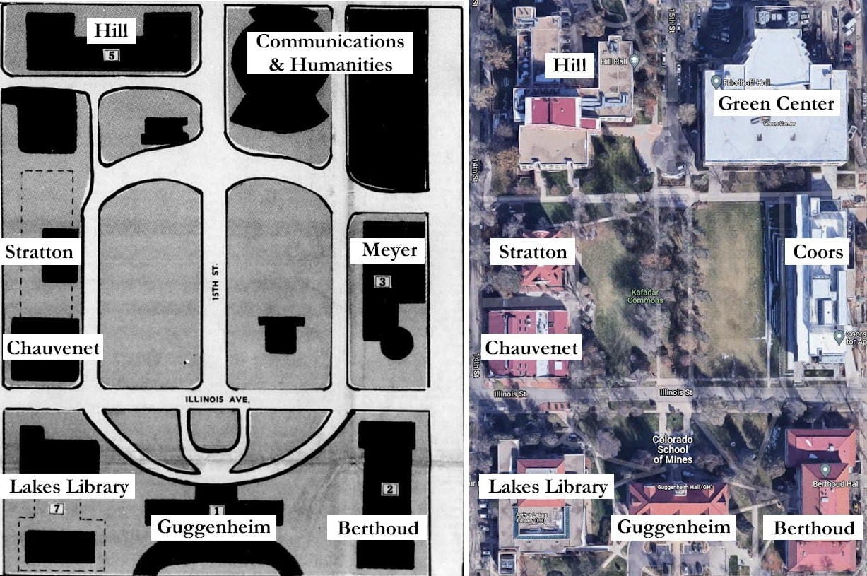 The October 20, 1966 Colorado Transcript announced a new central mall planned for the School of Mines campus. At the time, 15th Street through central campus contained several houses. The plan was to demolish them to create the new open space/mall.