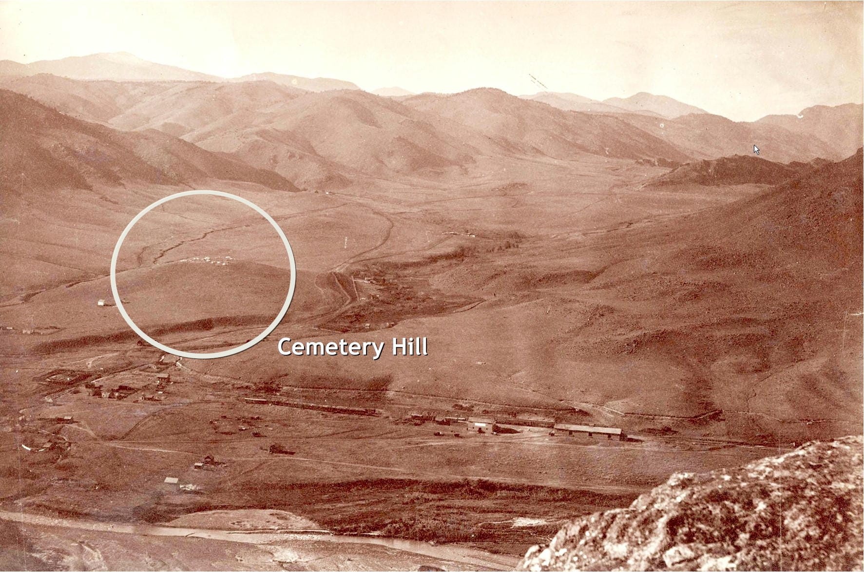 Golden’s original cemetery was located on a hill north of the city (map). It was probably chosen for its magnificent view, but as the quote above indicates, it was a difficult point to access–particularly for those conveying a coffin to the spot.
