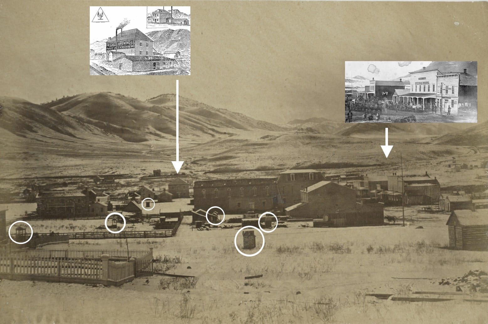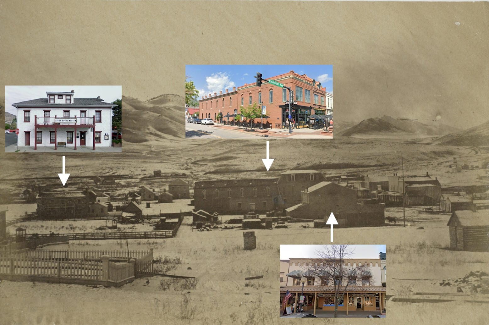 The Loveland building (now the Old Capitol Grill) appears in this photo, as does the Astor House. The Harrison Block (Del's Tonsorial Parlor, Humble House Coffee, and Creekside Jewelers) may be a little harder to identify, but it is one of the oldest buildings in Golden's downtown.