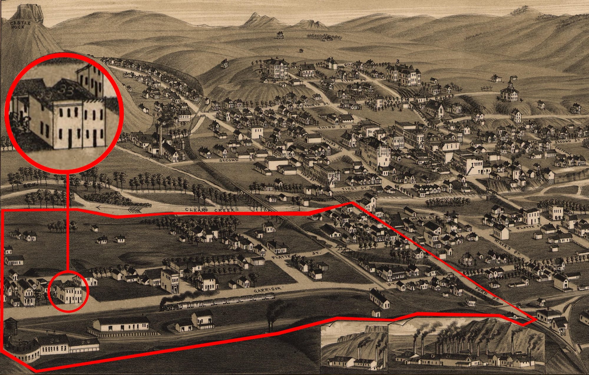 Excerpt from the 1882 Birdseye View Map of Golden, Colorado, with Goosetown outlined and the Omaha House circled.