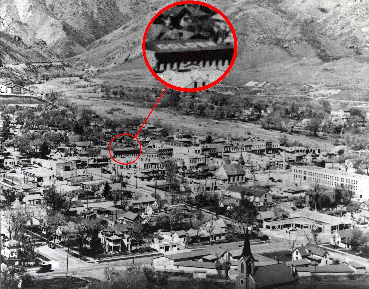 The January 9, 1936 Colorado Transcript announced that the Colorado National Guard planned to label towns so that aviators could identify them from the air. The display was also supposed to include an arrow, pointing to the nearest landing field. Mayor Jones speculated that the word “GOLDEN” would be painted on the roof of the Armory, the Opera House, or on one of the buildings on the Mines campus. Evidently the Opera House was chosen.
