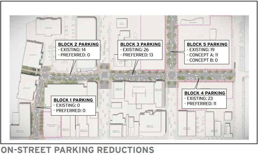 This will result in a significant reduction in available parking spots. Page 39 of the meeting packet refers to "removing 51 on-street parking spaces." The diagram above shows a loss ranging from 47-58 spaces.