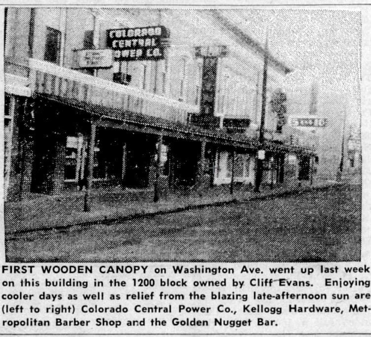 Leo Stillman (Opera House/Ace Hi Tavern) built his canopy in 1968. The former bank building at 12th and Washington (shown at the top of the article–now Golden Goods) gained its canopy in 1969, and Eaker’s Department Store (now the Buffalo Rose Events Center) built theirs in 1970.