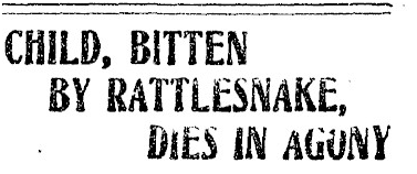 A two year old child was playing in the yard while his mother was hanging clothes on a line nearby. He was bitten just below the knee by one of the largest rattlesnakes “…ever seen in this vicinity. It measured 40 inches and had twelve rattles.” The mother killed the snake and called the neighbors for help. They applied a tourniquet to the leg and tried to suck out the poison. Dr. Kelly was called, but could do nothing. The child died the same evening.