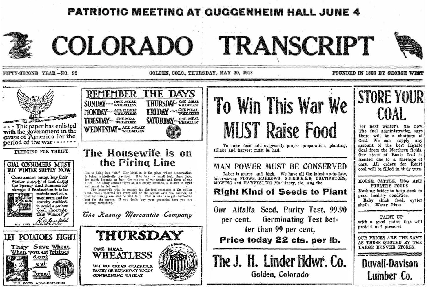 On May 30th, 1918, the country had entered World War I, and Golden was on war-time footing. The Colorado Transcript of that date was encouraging people to buy their coal for next winter, because of an anticipated shortage. By general order, eating houses were only allowed to serve two sugar lumps with meals and women were being urged to preserve eggs.