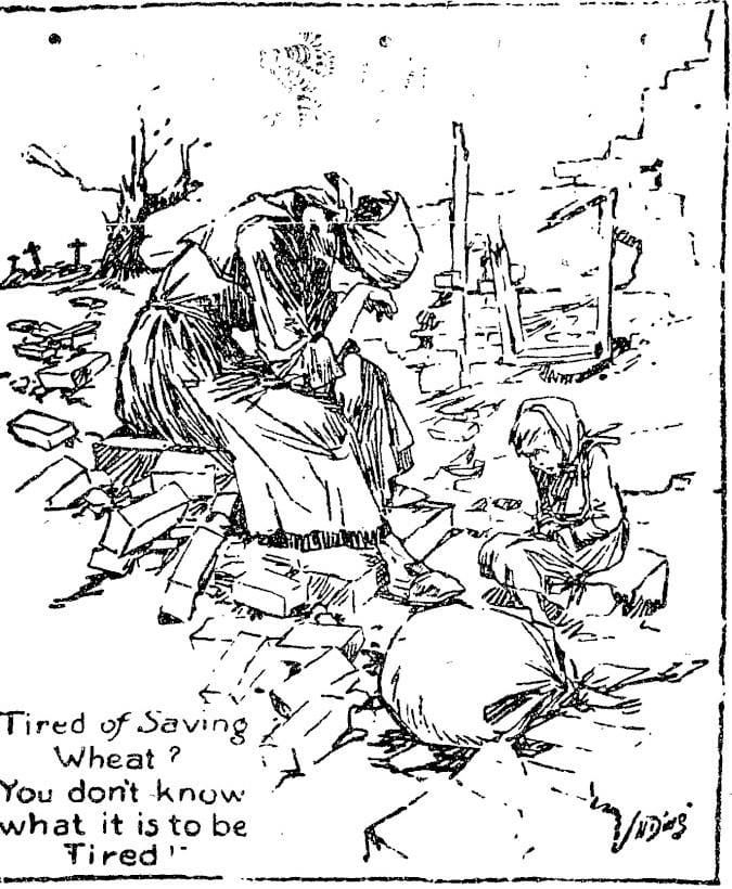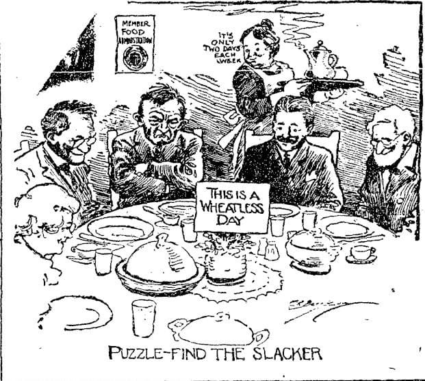 The United States was sending wheat to help feed its allies in Europe. Americans were encouraged to eat wheat sparingly, with Monday and Wednesdays being “wheatless” days, and eating wheat at only one meal a day on the other five days. It was OK to eat potatoes, as illustrated by the ad above (lower left-hand corner) showing a fighting potato.