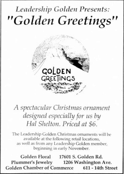 The November 25, 1986 Golden Transcript announced that the Leadership Golden Alumni Association had just released a Christmas ornament, featuring a drawing of Castle Rock by acclaimed Golden artist Hal Shelton. Sales of the ornaments helped fund the following year’s Leadership Golden class.