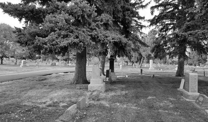 I found the markers–and what a difference 89 years makes! The warming house (now the cemetery office) is still there, but it’s hidden behind a big Colorado Spruce.