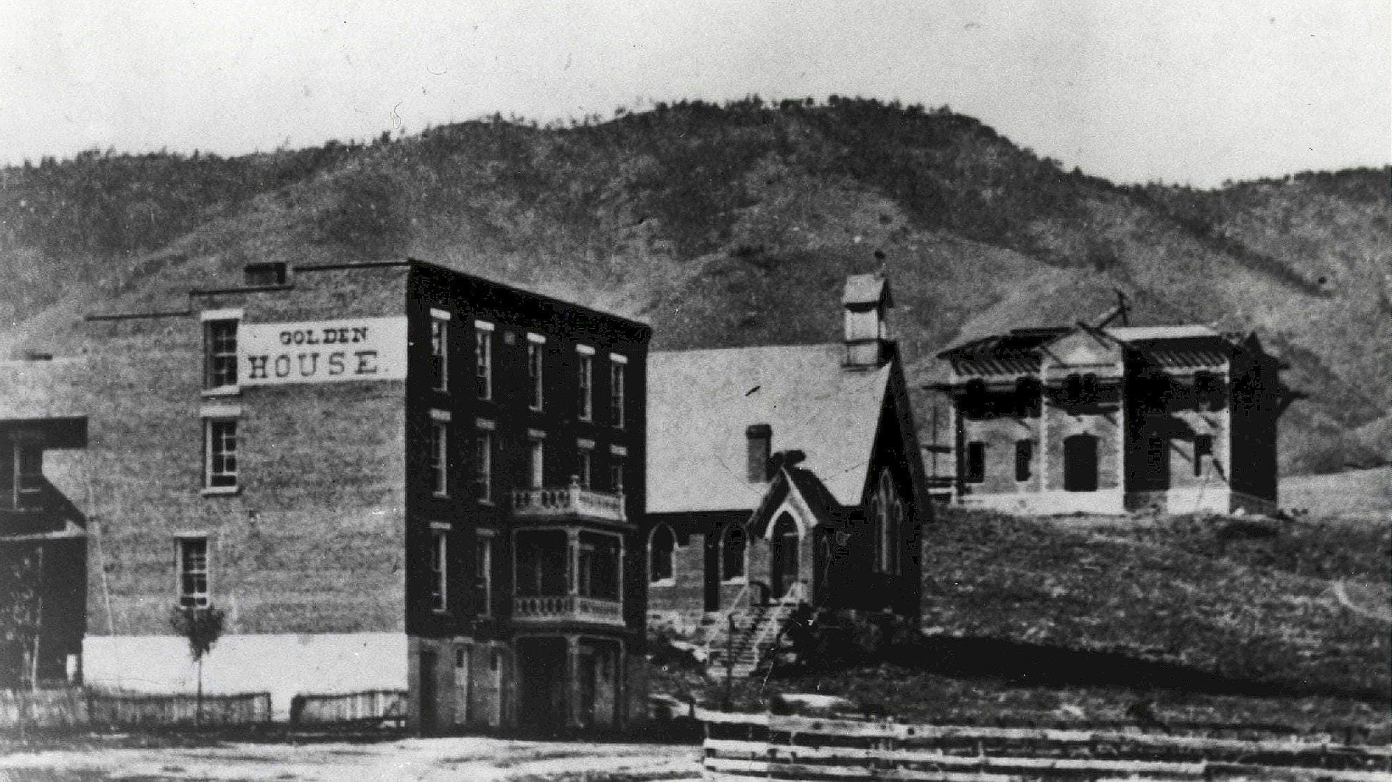 The Golden House hotel stood where the Armory now stands, at 13th and Arapahoe. South School is under construction in the background, which dates this photo as 1873. Calvary Church appears between the hotel and the school. Photo from the Dan Abbott collection.