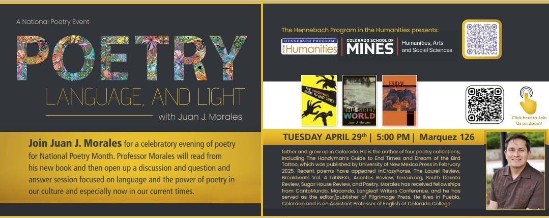 Join Juan J. Morales for a celebratory evening of poetry for National Poetry Month. Professor Morales will read from his new book and then open up a discussion and question and answer session focused on language and the power of poetry in our culture and especially now in our current times.