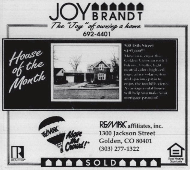 In domestic news, Realtor Joy Brandt was selling the home at 500 18th Street for the asking price of $195,000. "A carriage rental house will help you make your mortgage payment!"